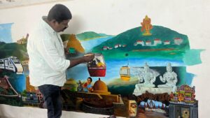 This remarkable work was crafted by Mr. Moka Vijay Kumar, husband of Mrs. Sunita Moka, a Partner at Chitralekhanam. Born on August 30, 1974, Mr. Vijay Kumar, a resident of Visakhapatnam, Andhra Pradesh, Bharat, is an Indian Railways (Vizag) employee and a passionate artist with a gift for acrylic painting. His latest creation spans an impressive 4 feet in height and 24 feet in length, depicting 53 significant locations across Andhra Pradesh, Odisha, and Chhattisgarh.