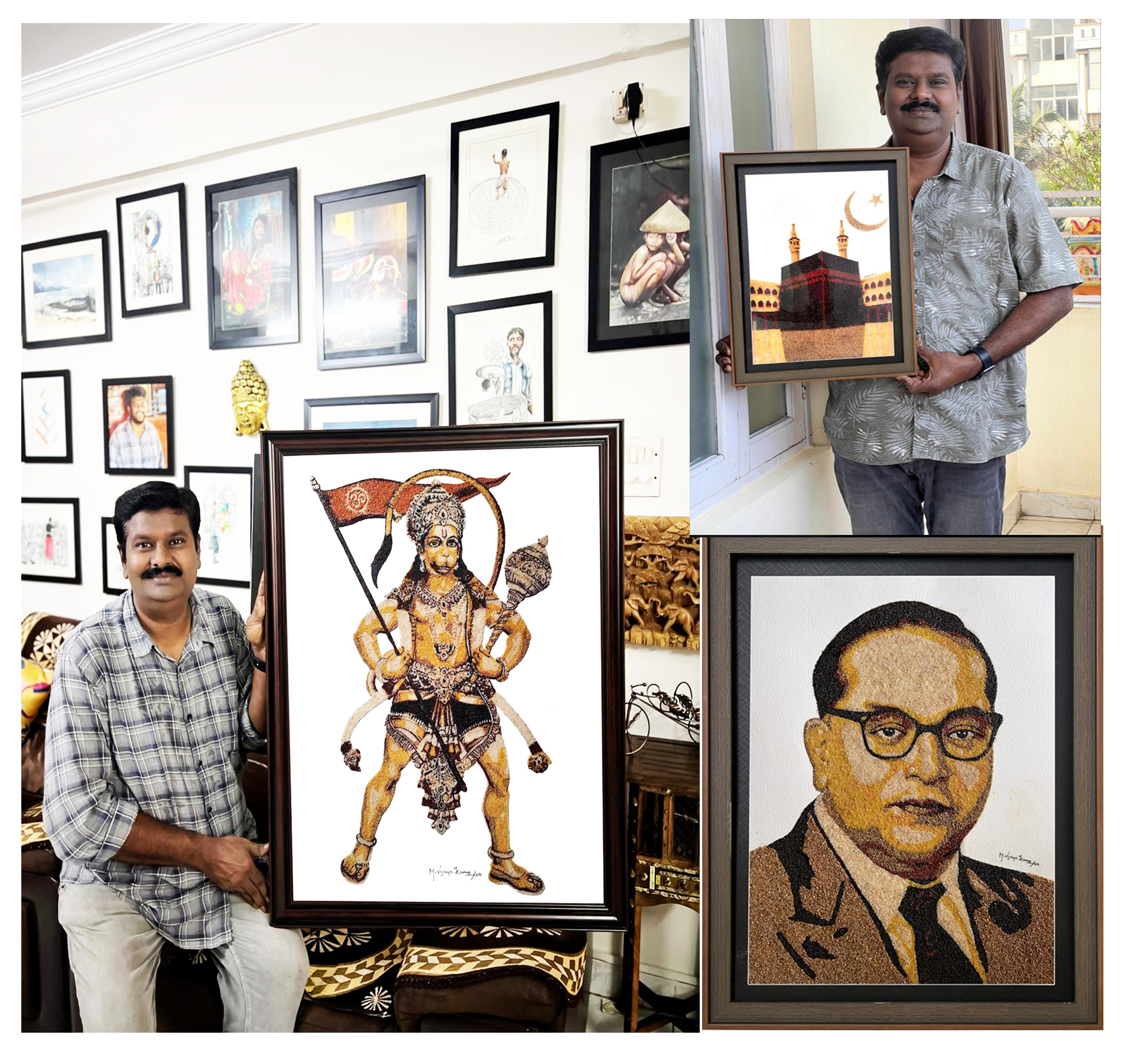 Mr. Moka Vijaya Kumar S/o Sri Adinarayana (late) (born on August 30, 1974) from Visakhapatnam, Andhra Pradesh, Bharat, is by profession an Indian Railways (Vizag) employee and by passion a creative and innovative artist making paintings with millets, also known as “MILLET PAINTINGS”. With this innovative concept, he made hundreds of mythological, human, and nature paintings, and displayed them in many exhibitions. These paintings significantly convey the importance of incorporating millets into our diets, despite their numerous health benefits. This innovative creation has been appreciated by the Telugu Book of Records.